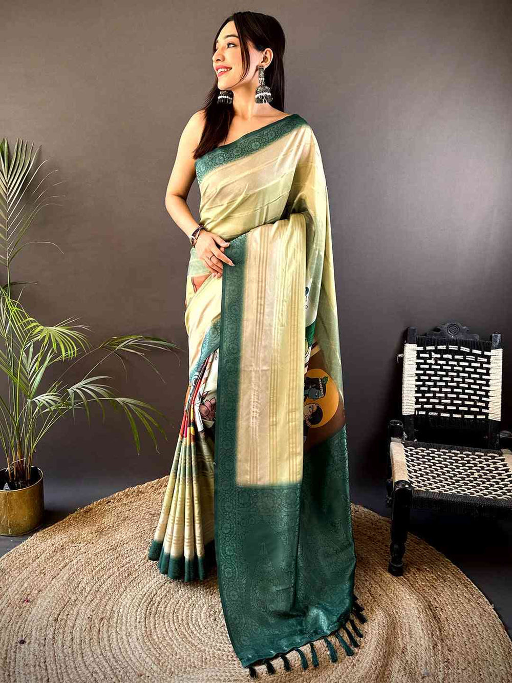 The saree features intricate Kalamkari inspired prints along the pleats, showcasing cultural motifs, artistic figures, and vibrant storytelling elements. The woven green zari border enhances the richness of the saree, while the matching tassel pallu adds a refined finishing touch.