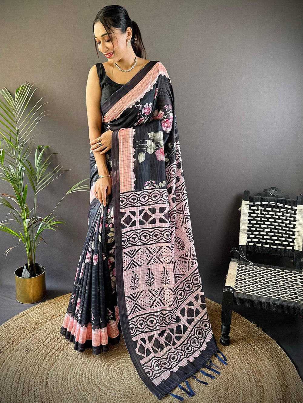 Add a touch of contemporary elegance to your wardrobe with this stunning black linen soft silk saree, beautifully enhanced with delicate pink floral prints that bring a feminine and graceful charm. The rich black base offers a bold, classy appeal, making the saree perfect for both festive occasions and stylish day outings.