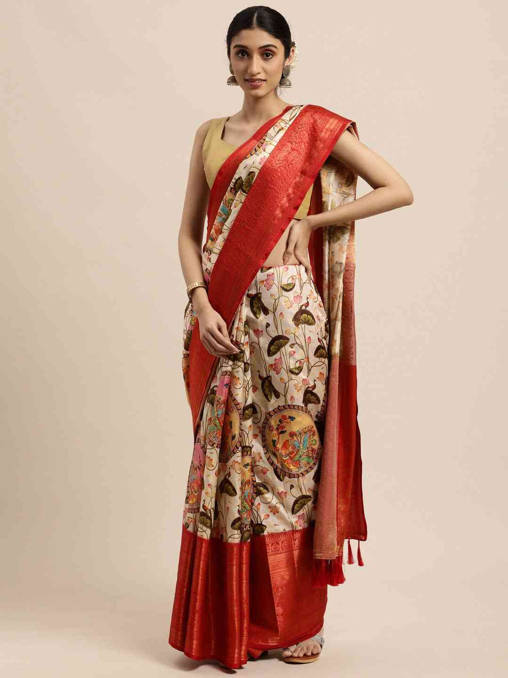 Red Soft Silk Saree with Artistic Multi-Color Madhubani Print & Jacquard Woven Border
