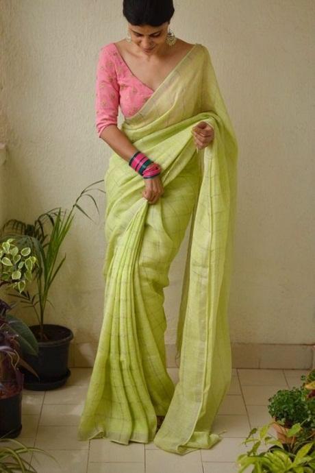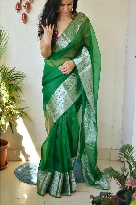 Brilliant Green Color Linen Designer Hand Weaving Jacquard Saree SY 865