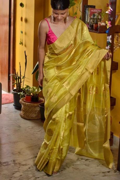 Lemon Yellow Color Designer Hand Weaving Occasional Wear Soft Cotton Silk Sari SY 878
