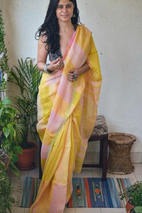 Delightful Yellow Color Linen Designer Hand Weaving Saree SY 832