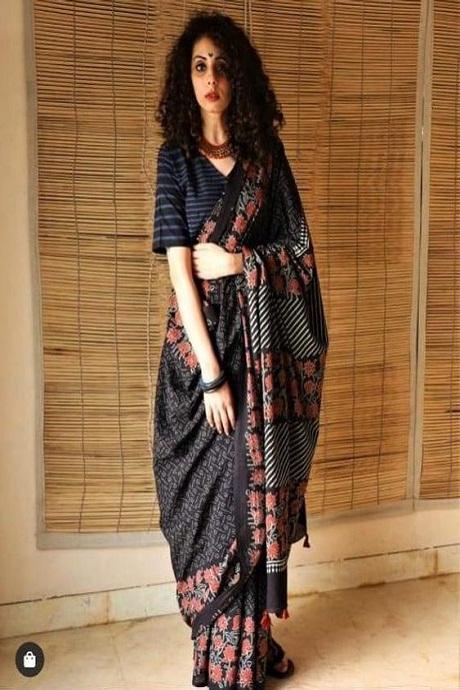 Charismatic Grey Color Linen Block Print Saree SY 842