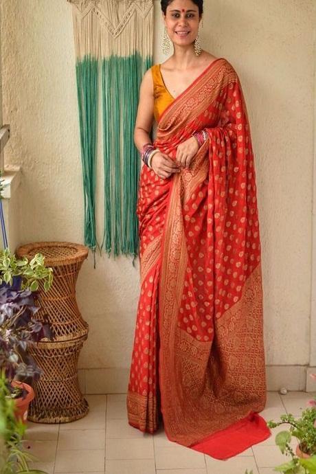 Desiring Red and Golden Color Hand Loom Linen Digital Print Saree SY 835