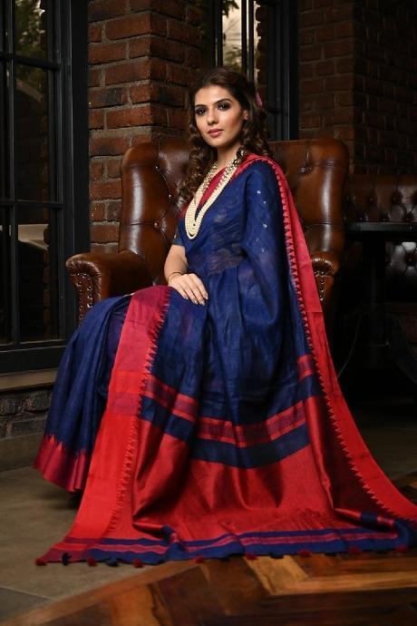 Fanciful Blue N Red Color Soft Linen Silk Jacquard Saree SY 577