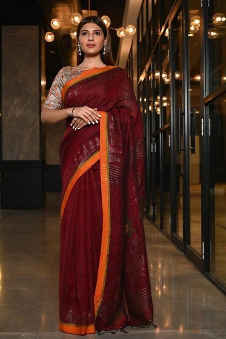 Desiring Maroon Color Linen Block Printed Saree SY 214