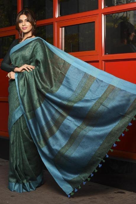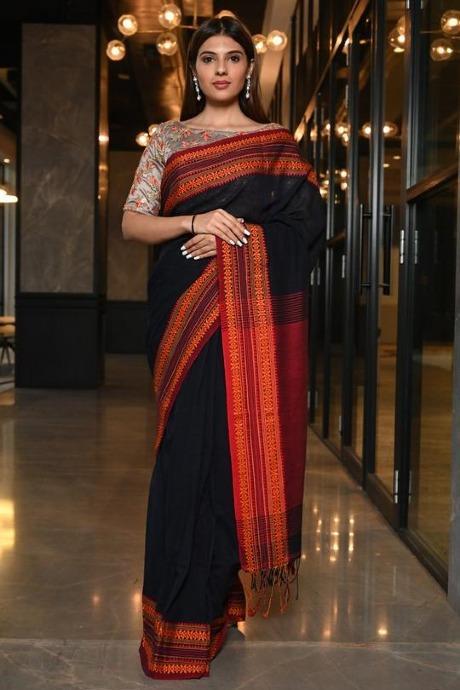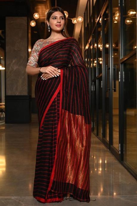 Black Color Hand Loom Linen Designer Machine Weaving Saree SY 222