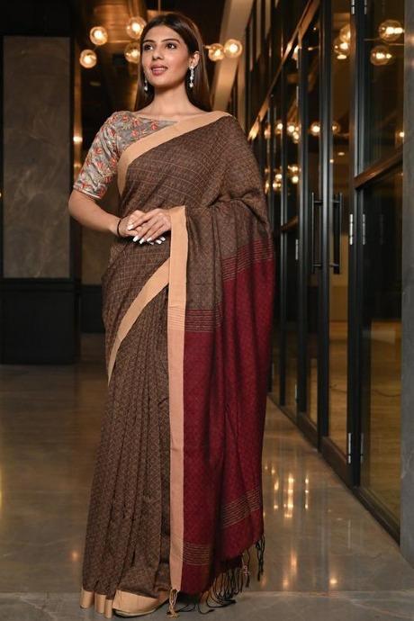 Coffee Color Hand Loom Linen Designer Hand Weaving Saree SY 238