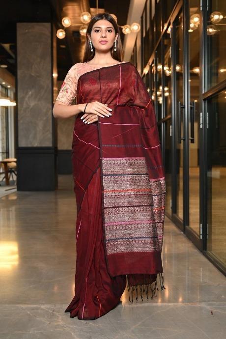 Maroon Color Hand Loom Linen Hand Weaving Saree SY 224