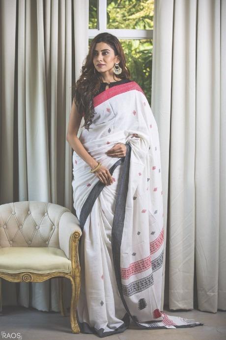 White Color Hand Loom Linen Designer Jacquard Saree SY 219