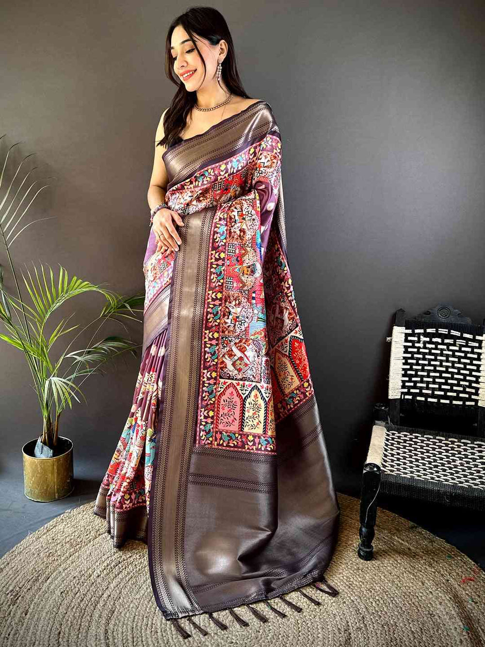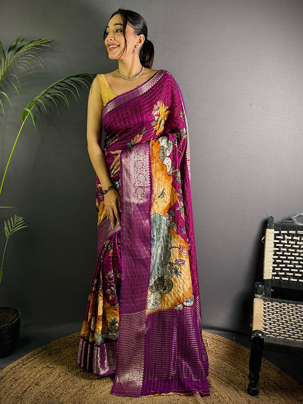 Magenta Soft Silk Saree with Artistic Digital Print & Woven Zari Border