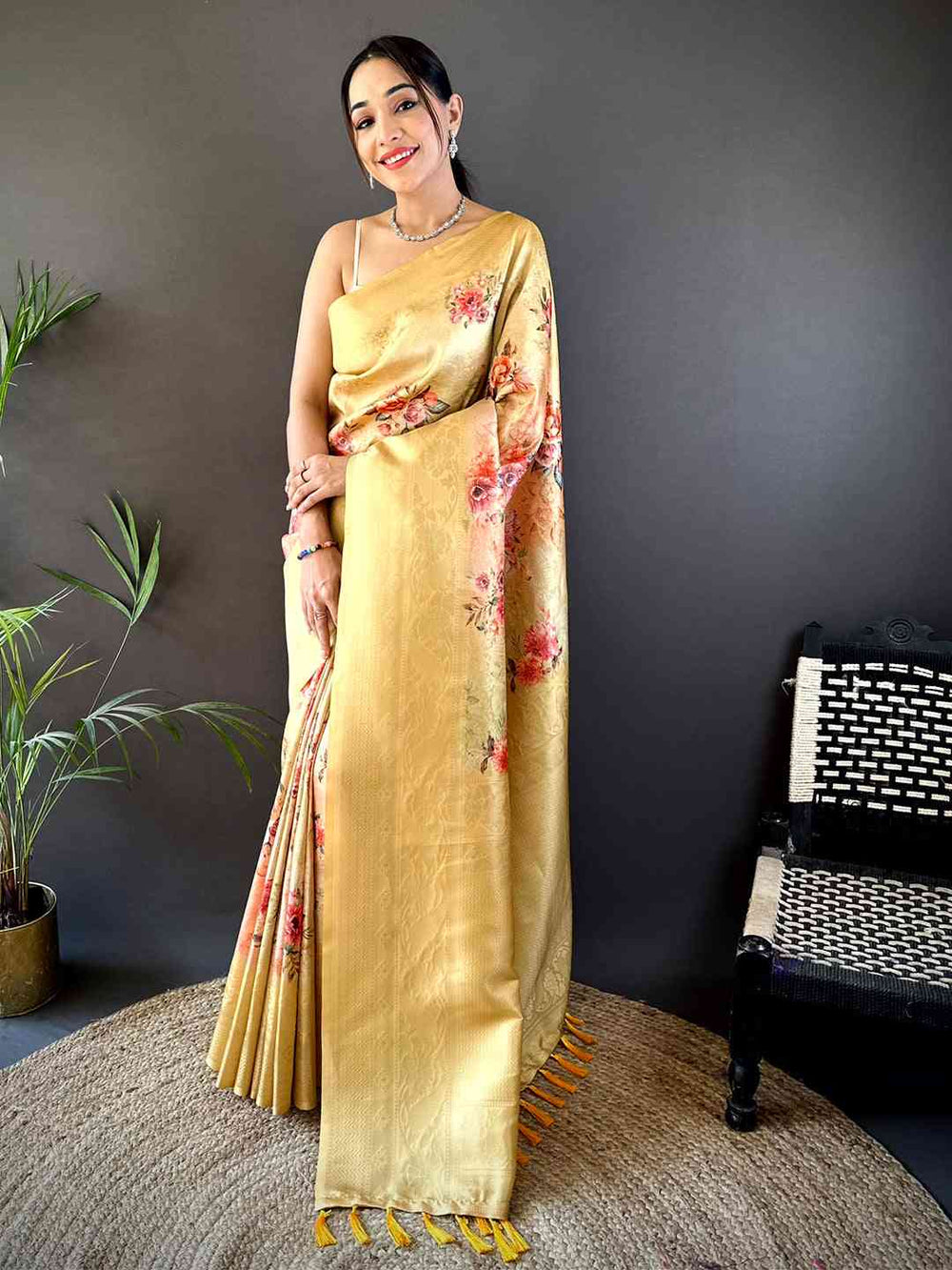 Pastel Yellow Soft Silk Saree with Subtle Floral Print & Elegant Tassel Pallu