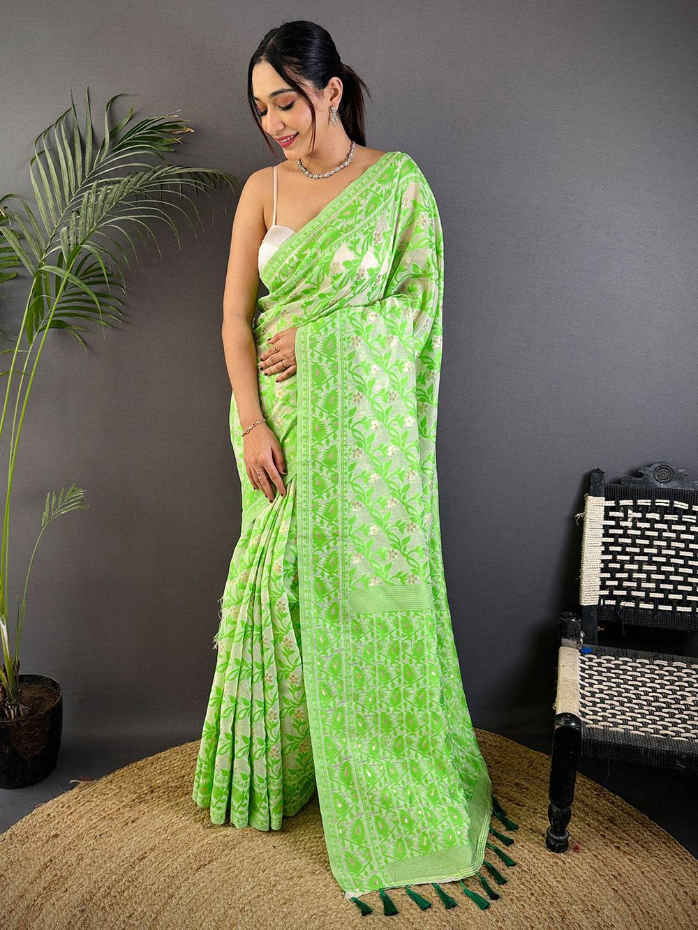 Lime Green Soft Silk Saree with All-Over Jacquard Weaving & Tassel Border