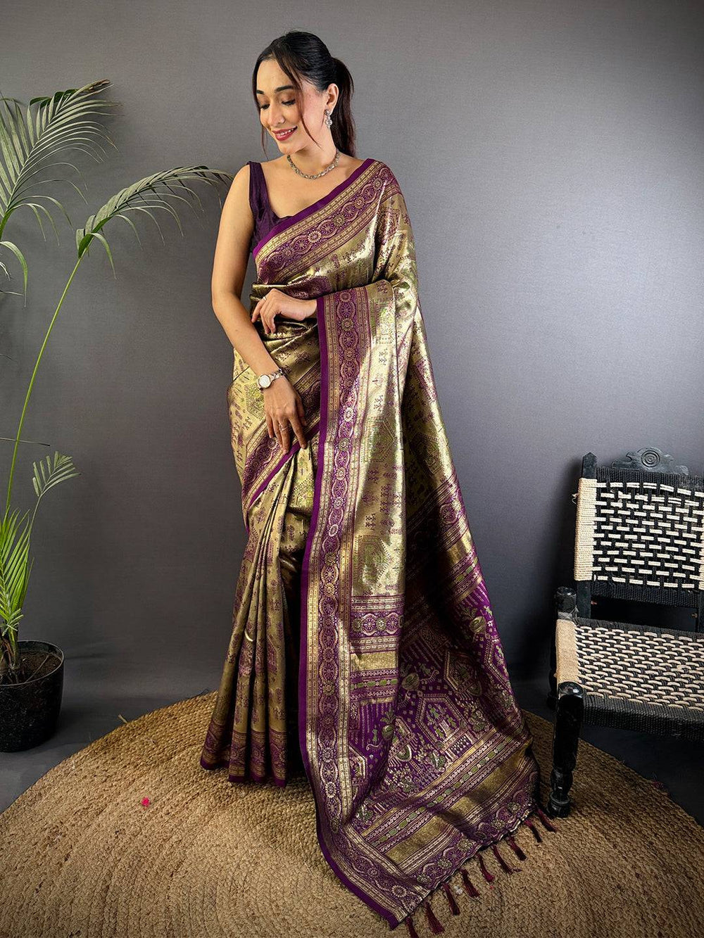 Olive Green & Purple Banarasi Soft Silk Saree with Rich Zari Weaving