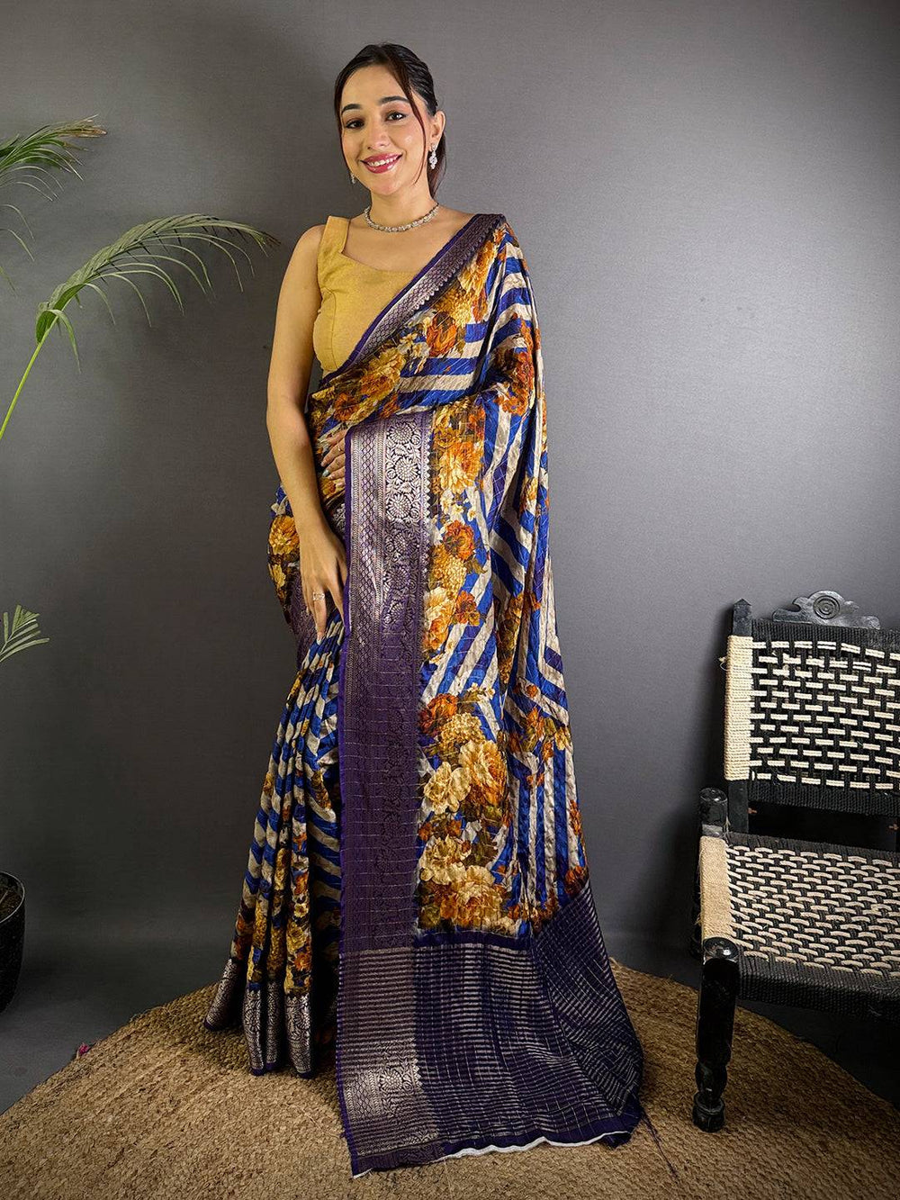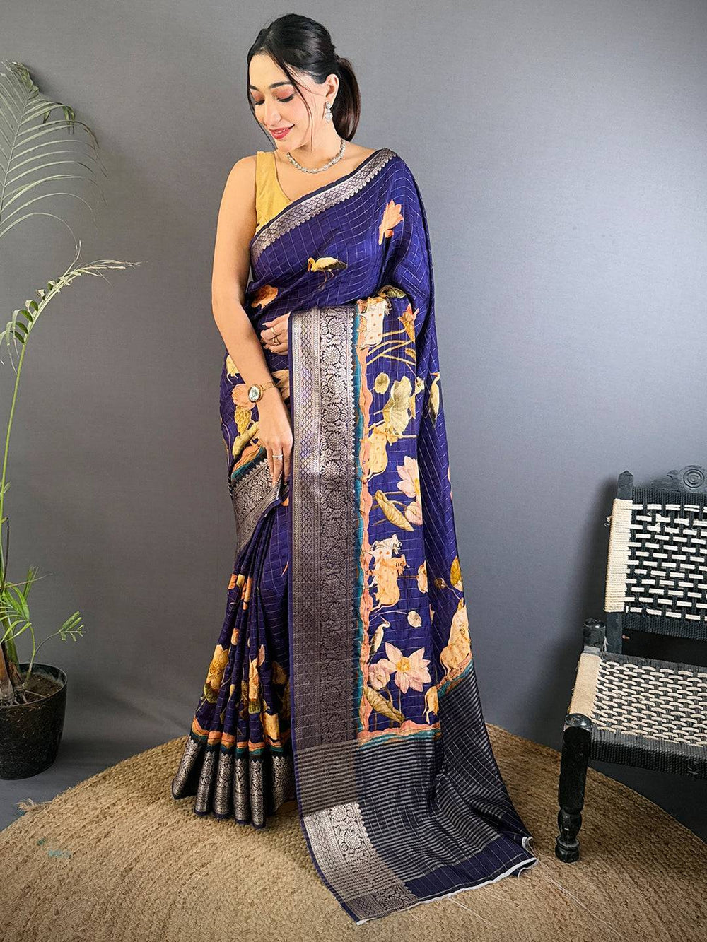 Navy Blue Soft Silk Saree with Floral Print & Zari Border