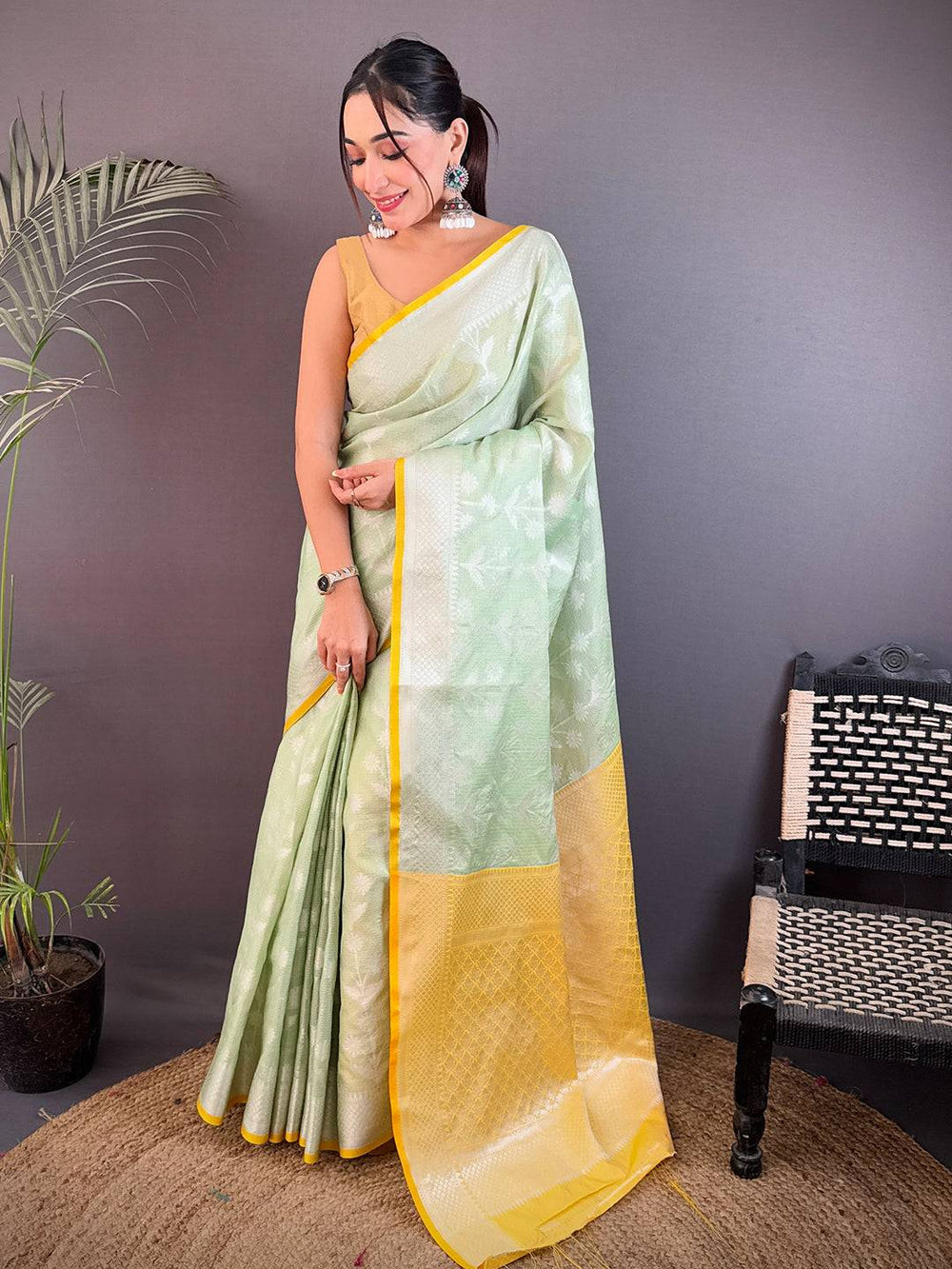 Pastel Green Soft Silk Saree with Silver Zari Weaving & Yellow Border