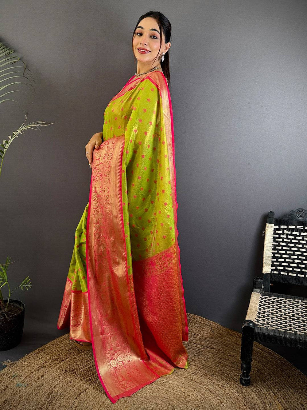 Lime Green & Pink Banarasi Silk Saree with Gold Zari Weaving & Rich Contrast Pallu