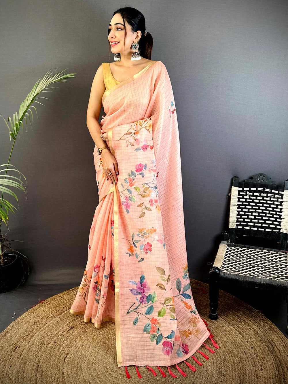 Peach Linen Silk Saree with Multicolor Floral Digital Print & Tassel Border
