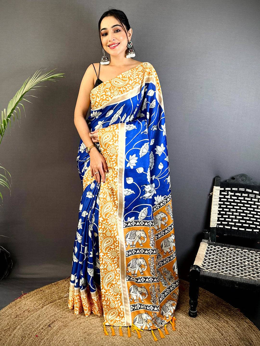 Blue & Mustard Linen Silk Saree with Floral Print & Elephant Motif Border