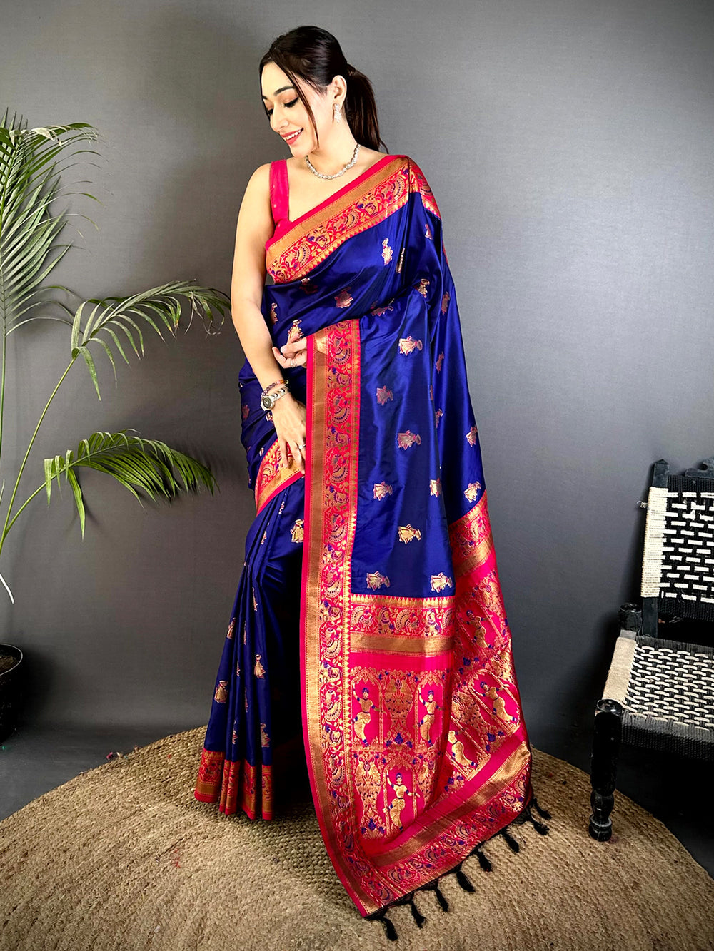 Royal Blue Banarasi Silk Saree with Gold Zari Motifs & Pink Dancing Figure Pallu