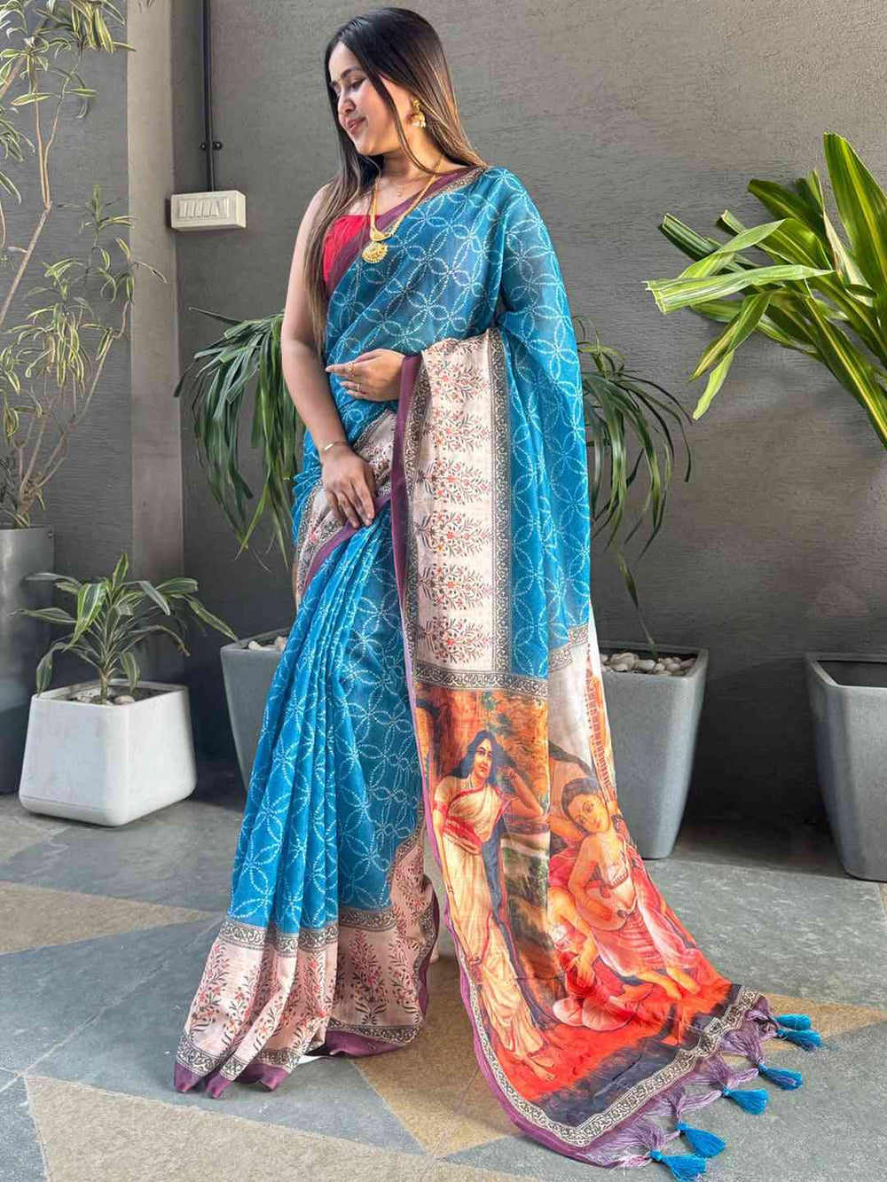 vy Blue Soft Silk Saree with Floral Digital Print & Silver Zari Border