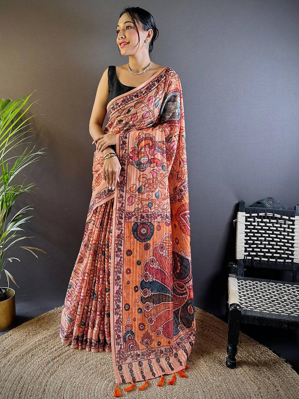 Peach Madhubani Print Soft Silk Saree with Peacock Artwork & Tassel Pallu