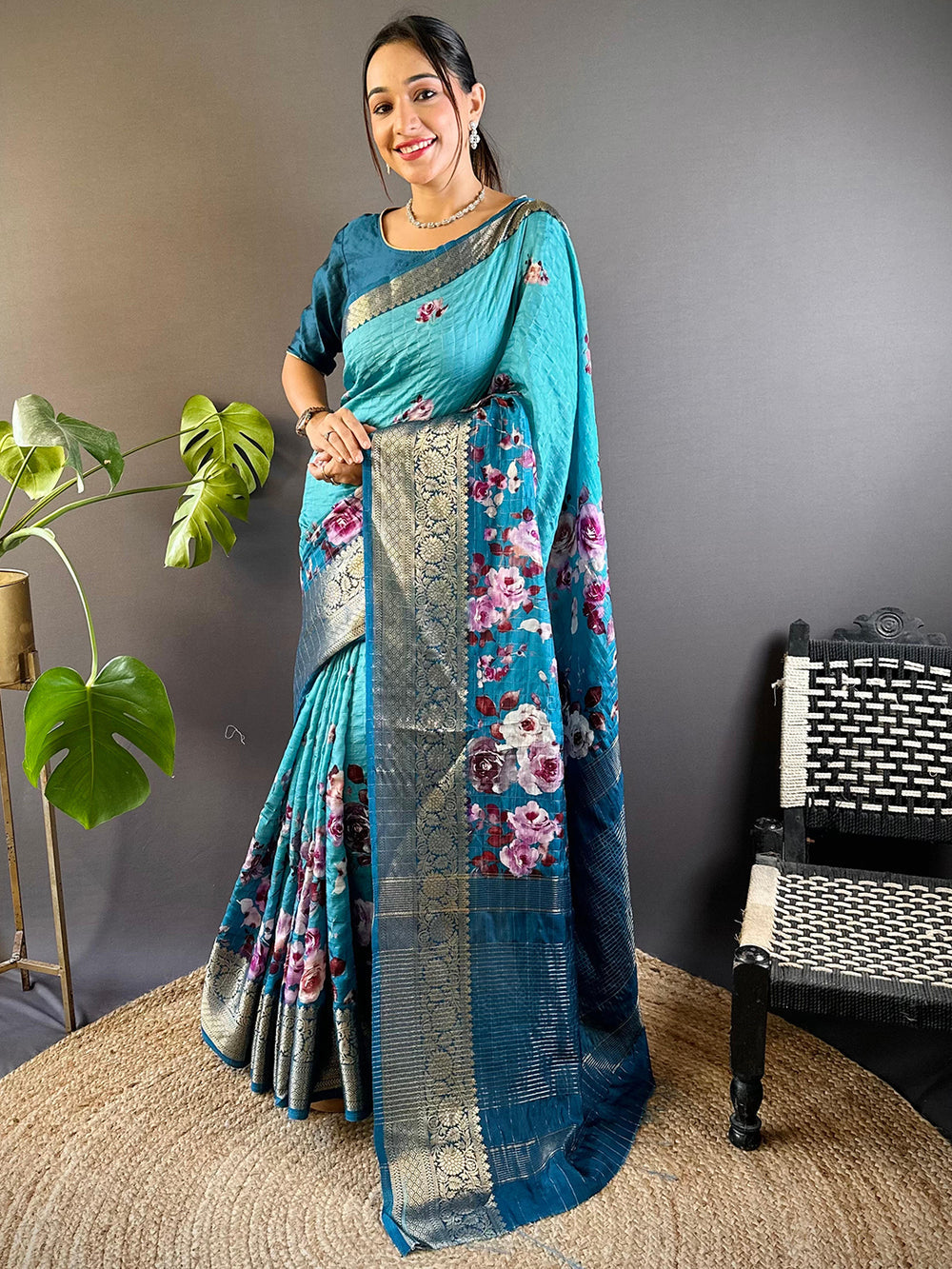 Teal Floral Printed Soft Silk Saree with Golden Zari Border