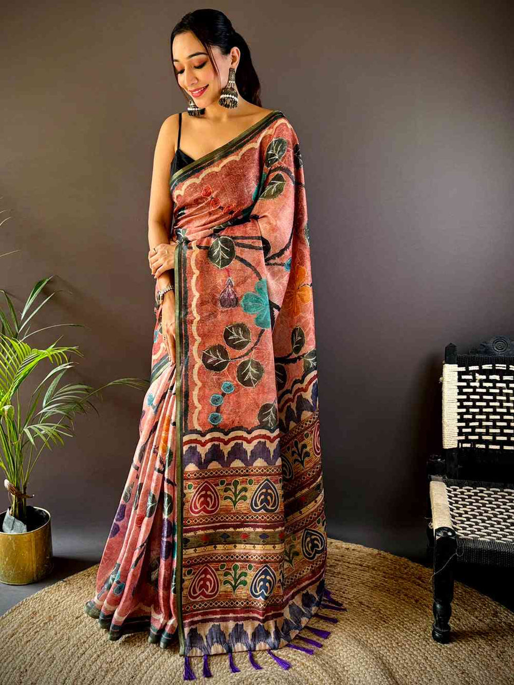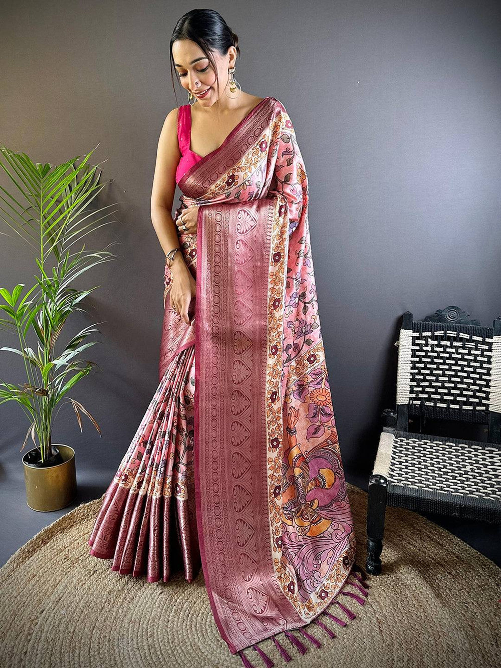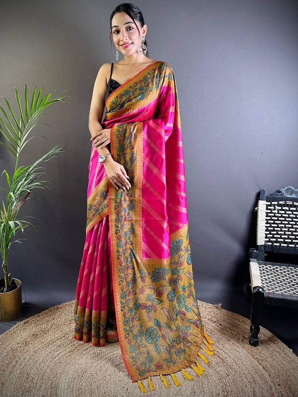Pink & Mustard Floral Printed Soft Silk Saree with Zari Border & Tassel Pallu