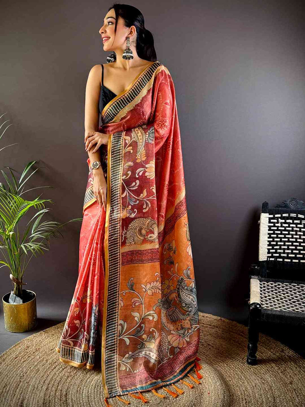 Rust Orange Soft Silk Saree with Hand Painted Style Floral Print & Traditional Border
