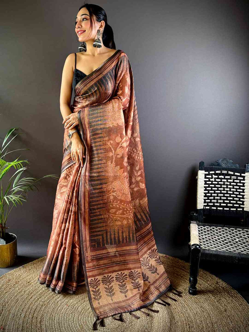 Brown Soft Silk Saree with Ethnic Floral Print & Traditional Border