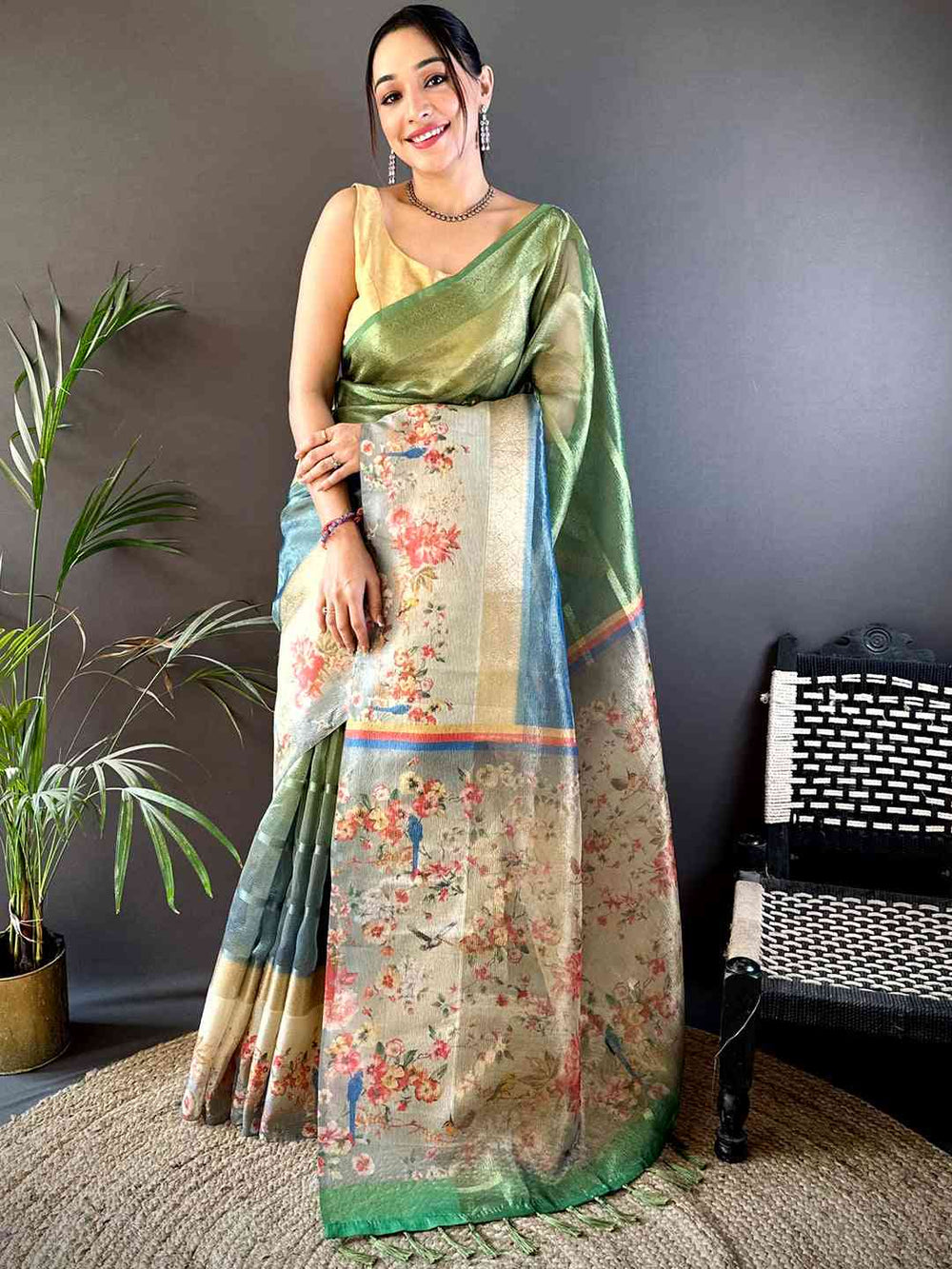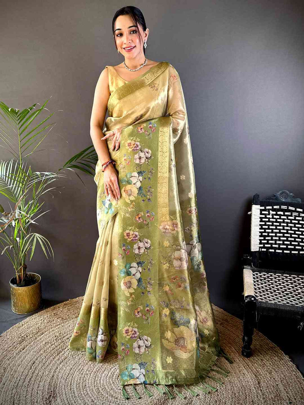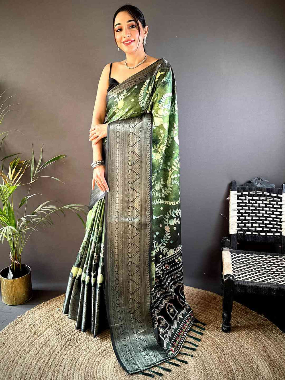 Cream & Olive Green Soft Silk Saree with Digital Floral Print and Zari Border
