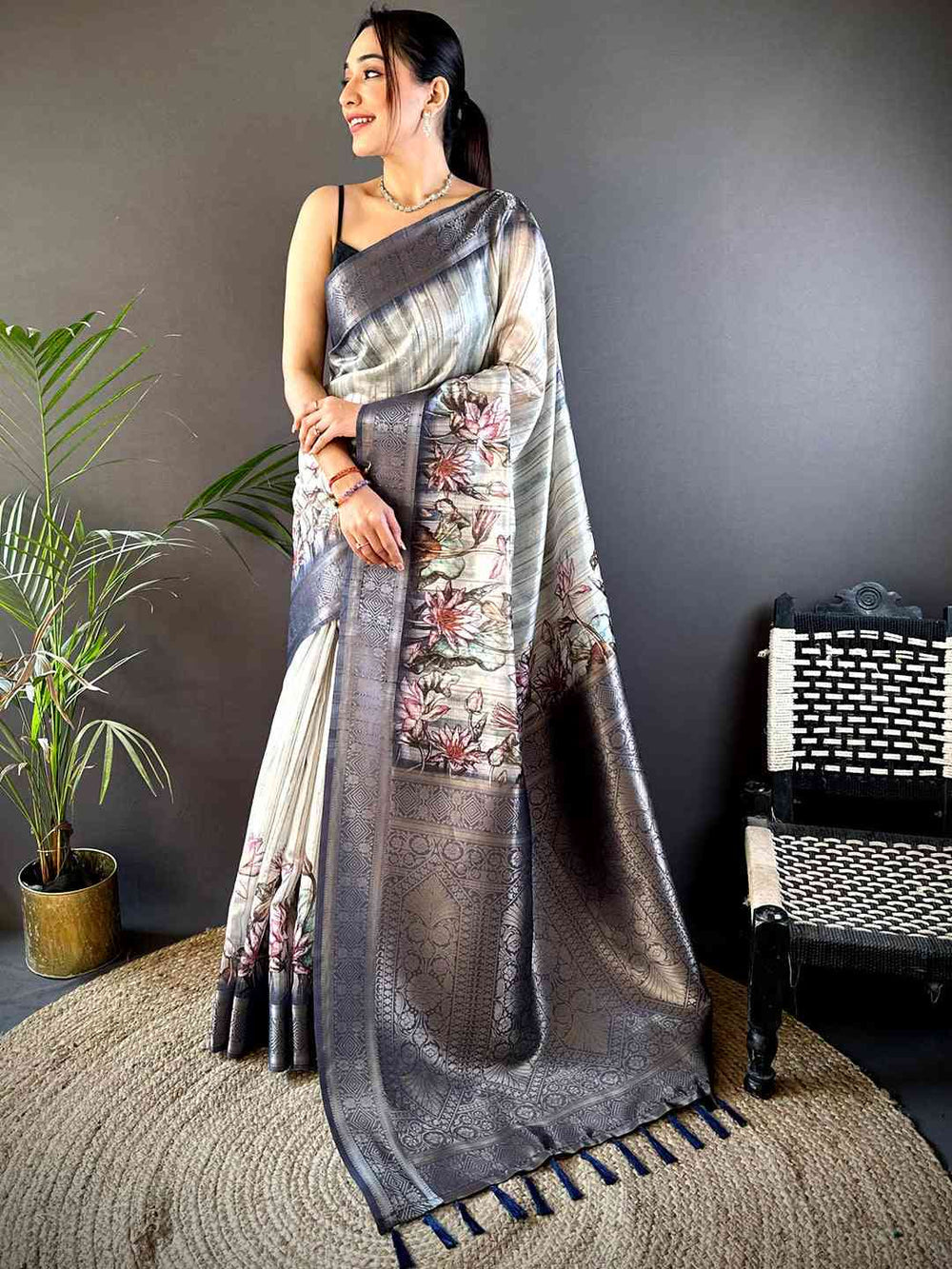 Grey Soft Silk Saree with Floral Print & Rich Zari Border