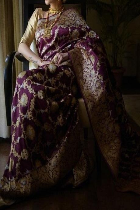Divine Purple Colored Golden Flower Gota Machine Weaving Soft Silk Sari SY 1106